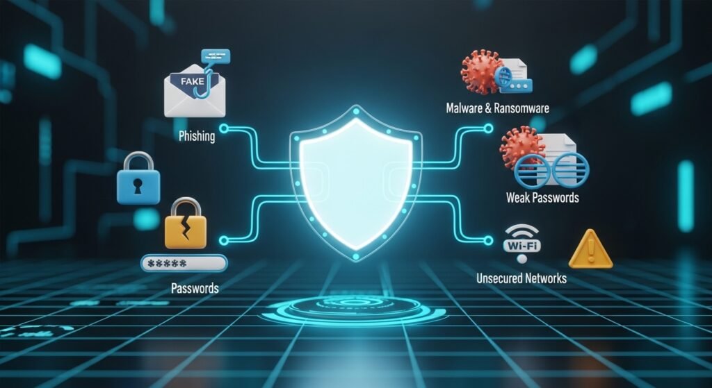 Common threats include phishing attacks, malware and ransomware, weak passwords, and unsecured networks. Understanding these threats is the first step toward effective protection.